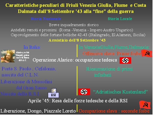 Rispetto al corso delle vicende belliche nel resto d’Italia, dopo l’8 settembre ‘43 nelle regioni del Nord Est (Friuli, Venezia Giulia Fiume, Istria e Dalmazia) gli avvenimenti seguono un corso completamente diverso, che identificano una “storia locale” purtroppo quasi mai riportata nei libri scolastici, e sconosciuta ai più.