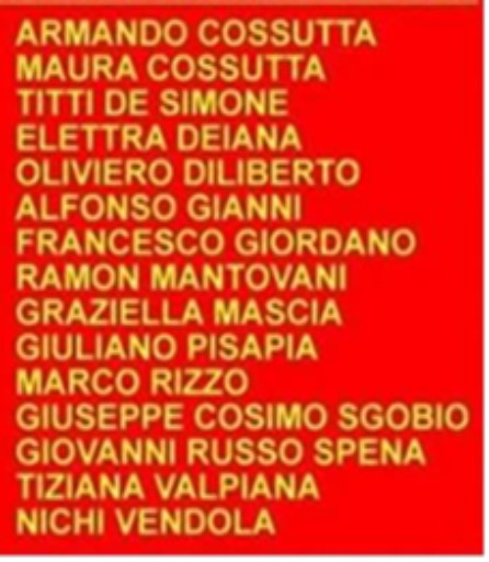 Armando Cossutta, Maura Cossutta , Titti De Simone, Elettra Deiana , Oliviero Di Liberto, Alfonso Gianni, Francesco Giordano Ramon Mantovani, Graziella Macia, Giuliano Pisapia, Marco Rizzo, Giuseppe Cosimo Sgobio, Giovanni Russo Spena, Tiziana Valpiana, Nichi Vendola