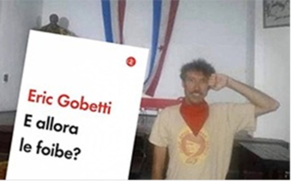 Questo è lo “storico” Eric Gobetti, autore di vari pamphlets. Con questa foto pubblicizza il suo libro : si noti il fazzoletto rosso al collo l’immagine di Tito sulla maglietta, le bandiere slave stellate di rosso, che non esistono più neanche dove le hanno inventate, la statua di Tito alle spalle, cioè i simboli di quelli che nelle Foibe ci gettavano morti, ma anche vivi, gli Italiani e i nemici: è spesso invitato come relatore non solo da ANPI, centri sociali e simili, ma anche nelle scuole.