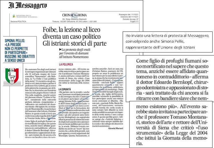 Prof Tomaso Montanari, rettore dell’Università per stranieri di Siena. Non si capisce a che titolo e con quale competenza parli di Foibe e Giornata del Ricordo, visto che è professore di storia dell’arte: potrebbe forse commentare la distruzione delle vestigia architettoniche veneziane, come i leoni di pietra che ornavano tutte le città costiere dell’Istria e della Dalmazia, guerra culturale che è proseguita negli anni ’90, con la distruzione delle moschee e nel ponte di Mostar, fra i pochissimi esempi di architettura civile lasciata dalla dominazione turca. Montanari sul tema, di cui non è certo un esperto, ha prodotto questa dichiarazione: ” La legge del 2004 che istituisce la Giornata del Ricordo (delle Foibe) a ridosso e in evidente opposizione a quella della Memoria (della Shoah) rappresenta il più clamoroso successo di una falsificazione storica».