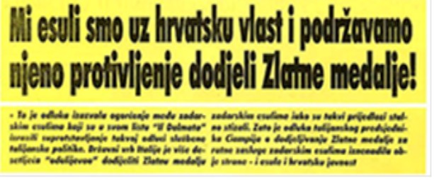 Ecco la traduzione letterale dell’incredibile testo del giornale croato di Zara “Regional”:” NOI ESULI SIAMO DALLA PARTE DEL GOVERNO CROATO E SOSTENIAMO LA SUA DISAPPROVAZIONE ALL’ASSEGNAZIONE DELLA MEDAGLIA D’ORO ”