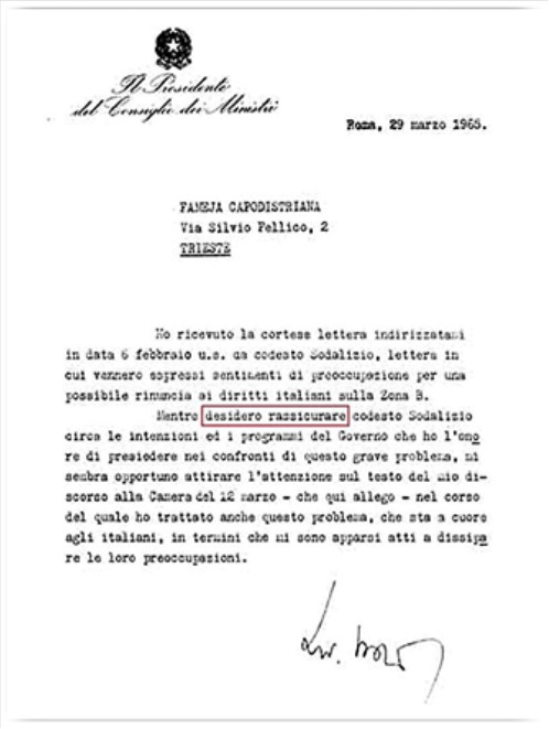 29 marzo 1965: lettera del Presidente del Consiglio dei Ministri, Aldo Moro, indirizzata alla Fameia Capodistria, in risposta ai timori che gli erano stati fatti presenti rispetto al continuo cedimento italiano alle pressioni di Tito affinché la Zona B venisse ceduta alla Jugoslavia. Dieci anni dopo, nell’ottobre 1975, solo un mese prima di firmare l’Accordo di Osimo, e sempre nella veste di capo del Governo, analoghe false assicurazioni erano giunte per lettera al Presidente dell’Unione degli Istriani di allora, Lino Sardos Albertini.