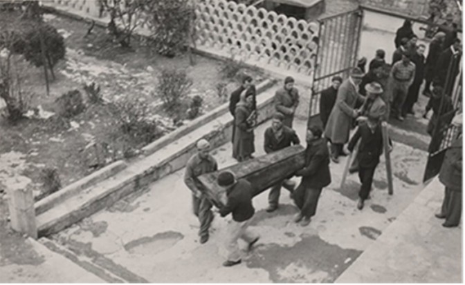 Partigiani italiani dell’Associazione Partigiani Italiani (A.P.I.) di Pola trasportano la salma di Nazario Sauro presso la propria sede, dove è stata allestita una camera ardente (1 febbraio 1947). L’esumazione e la traslazione della salma di Nazario Sauro dal cimitero militare di Pola venne eseguita dall’Associazione Partigiani Italiani (A.P.I.) di Pola, costituitasi nell’ottobre 1946, il cui segretario provinciale, Dino Leonardo Benussi, condusse personalmente le operazioni effettuate nottetempo e con continua scorta armata, per evitare che gli jugoslavi potessero impedirne lo svolgimento.