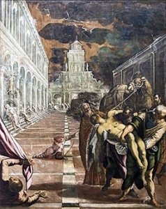 Nell’828 il corpo di San Marco venne trafugato dai veneziani Buono da Malamocco e Rustico da Torcello ad Alessandria d’Egitto e portato a Venezia (dipinto di Jacopo Tintoretto, Venezia Galleria dell’Accademia), dove costituì il simbolo della nuova città, sostituendo il culto bizantino di San Teodoro.