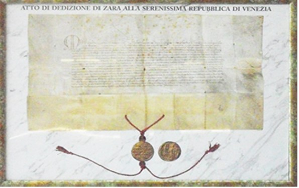 Il 31 Luglio 1409 con la Santa intrada, le insegne di San Marco fecero ingresso solenne nel Duomo di Zara ed il successivo 5 Settembre la città di Zara, capitale della Dalmazia , sottoscrisse l’Atto di Dedizione alla Serenissima.