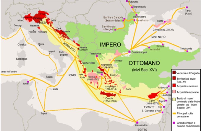 Nel Mediterraneo Venezia rivaleggiava con Genova, e il suo predominio sull’Adriatico, con l’eccezione di Ancona e Ragusa, rimaste indipendenti e alleate fra loro, era tale che i veneziani lo indicavano con il nome di “Golfo di Venezia”, in quanto dominio esclusivo dei navigatori veneziani.