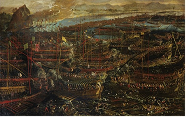 Il 7 ottobre 1571 nelle acque di Lepanto molteplici erano gli istriani e i dalmati che combatterono sotto le insegne della Serenissima Repubblica di Venezia nella flotta della Lega Santa che sconfisse l’Impero Ottomano: Alvise Cippico da Traù, comito della galea n. 39 dell’ala destra: per insegna “una donna con un mazzo di serpi in mano”. Giovanni de Dominis, comito del legno di Arbe, posta al n. 40 dell’ala destra: “San Giovanni con la Croce in mano”. Cristoforo Lucich, comandante la galea di Sebenico, n. 22 della retroguardia: “San Giorgio a cavallo”. Girolamo Bisanti da Cattaro, comito della galea n. 10 del corno destro : “San Trifone con una città in mano”. Giovanni Balzi da Lesina, galea n. 24 del corno sinistro: “San Girolamo”. Domenico di Tacco istriano, comito della nave n. 15 del corno sinistro: “Liona con mazza”, il cui equipaggio era costituito in prevalenza da capodistriani. Colane Drascio di Cherso, comito della galea n. 8: “Nicolò la corona”. Perasto “fedelissima” era, inoltre, presente con i gonfalonieri stretti attorno al gonfalone della nave ammiraglia della Serenissima: erano dodici e otto di essi caddero in battaglia. Sul contributo della Dalmazia: